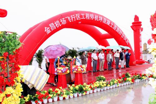 2010年8月20日上午10時(shí),金昌機(jī)場(chǎng)飛行區(qū)停機(jī)坪混凝土道面工程順利封倉(cāng)。甘肅省交通運(yùn)輸廳、金昌市政府、甘肅機(jī)場(chǎng)建設(shè)投資管理公司、甘肅機(jī)場(chǎng)項(xiàng)目建設(shè)指揮部及施工單位等有關(guān)單位領(lǐng)導(dǎo)現(xiàn)場(chǎng)見(jiàn)證了道面工程順利封倉(cāng)的時(shí)刻。
