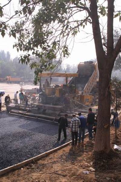 圖1—2為攤鋪機(jī)械正在跑道上進(jìn)行鋪設(shè)作業(yè)的場(chǎng)景