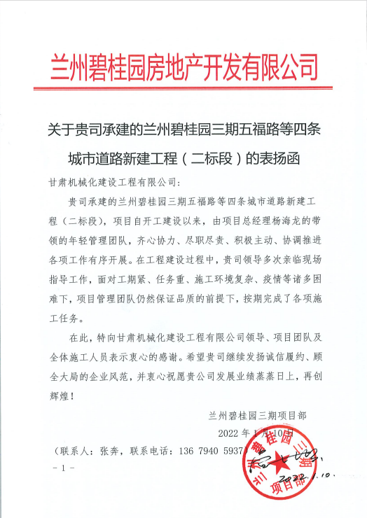 1月10日,我公司收到來自蘭州碧桂園房地產(chǎn)開發(fā)有限公司的表揚函,函中提到,蘭州碧桂園三期五福路等四條城市道路新建工程(二標段)項目自開工建設以來,項目人員面對工期緊、任務重、施工環(huán)境復雜、疫情等諸多困難,在保證品質(zhì)的前提下,按期完成了各項施工任務,提出表揚。