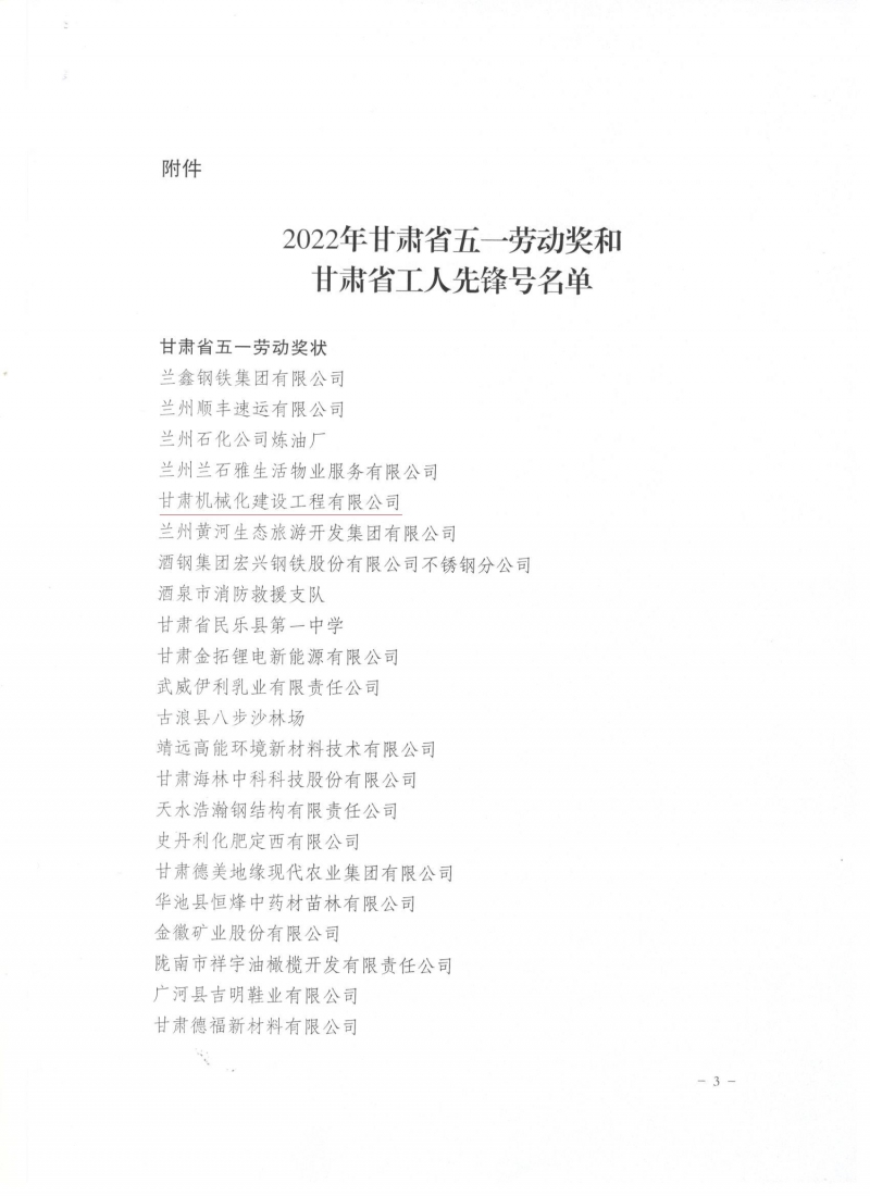 近日,甘肅省總工會發(fā)布了《關于表彰2022年甘肅省五一勞動獎和甘肅省工人先鋒號的決定》,我司被授予“甘肅省五一勞動獎”和“甘肅省工人先鋒號”。