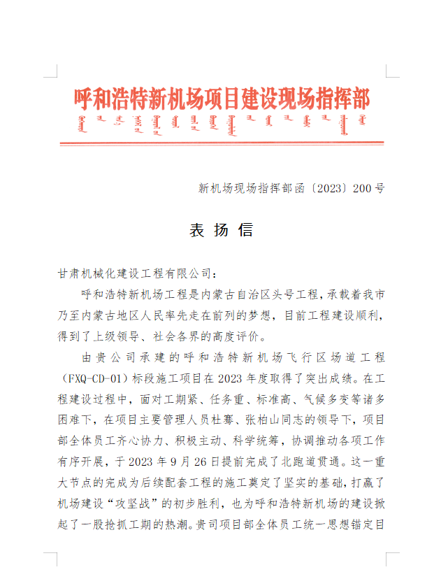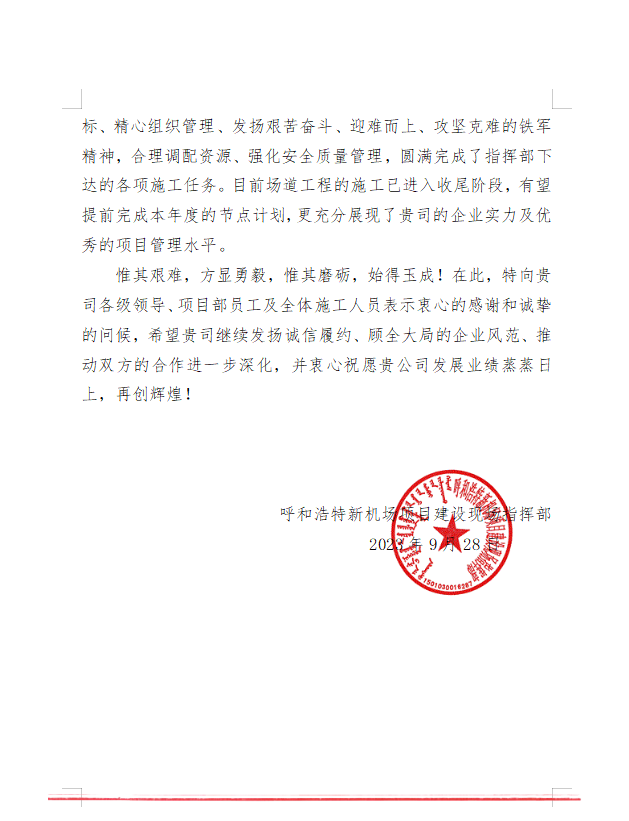 2023年9月28日,呼和浩特新機場項目建設(shè)現(xiàn)場指揮部給我司發(fā)來表揚信,信中充分肯定了我司在呼和浩特新機場項目建設(shè)中項目部全體員工統(tǒng)一思想錨定目標、精心組織管理、發(fā)揚艱苦奮斗、迎難而上、攻堅克難的鐵軍精神,合理調(diào)配資源、強化安全質(zhì)量管理,圓滿完成了指揮部下達的各項施工任務(wù)。
