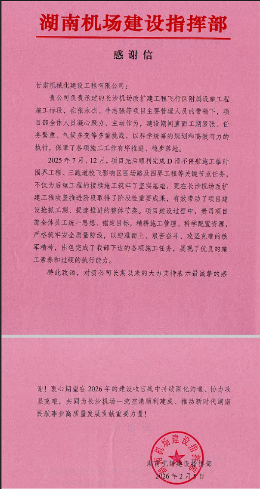 近日,我司接連收到甘肅省民航機(jī)場(chǎng)集團(tuán)、湖南機(jī)場(chǎng)建設(shè)指揮部發(fā)來的感謝信,對(duì)我司在蘭州中川國(guó)際機(jī)場(chǎng)三期擴(kuò)建工程、長(zhǎng)沙機(jī)場(chǎng)改擴(kuò)建工程中的突出表現(xiàn)給予高度評(píng)價(jià)與誠(chéng)摯感謝。